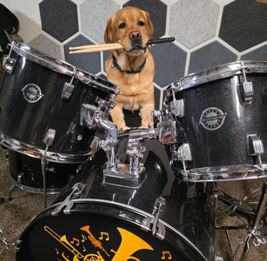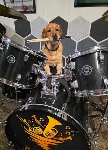 Goose Isn't just Brass storm's mascot - he's a trained service dog who works alongside mel, providing support on and off the stage. always steady, calm, and loyal, Goose brings a quiet strength wherever the music takes him. he proudly graduated from stand with me assistance dog training in Binghamton, NY, and has since been Mel's partner - whether in REHEARSALS, at concerts, or TRAVELING with the band. When he's off duty, goose enjoys relaxing with his favorite people, making new friends, and occasionally offering a well timed side-eye if a note goes astray.