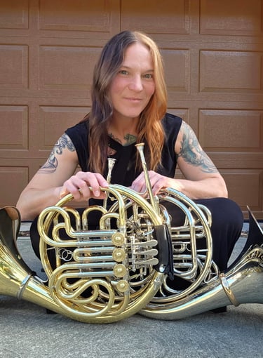 Mel’s musical journey began in middle school, where she first picked up the flute and played from 4th through 8th grade. By high school, she was ready to make a little more noise—joining the marching band and taking on trumpet and mellophone on the field. In concert band, she discovered her true voice on the French horn.She went on to study music at Marywood University, majoring on French horn. But when life took her in a new direction, Mel joined the military, stepping away from music for nearly two decades—except for the solemn honor of performing “Taps” on trumpet for military ceremonies.In 2024, Mel reignited her passion for music, returning to the French horn with renewed purpose. She now performs with the Crystal Band of Scranton, the Keystone College Symphonic Band, and Brass Storm.Always by her side (and sometimes offering a JUDGEMENTAL ear for missed notes) is her service dog, Goose—the beloved and unofficial mascot of Brass Storm.
